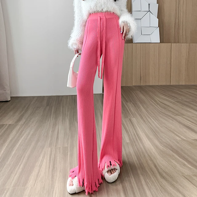Fungus Patchwork Wide Leg Pants High Waist Drawstring Solid Color Knitting Trousers Women Loose Straight Pantalones Pants Capris Aliexpress